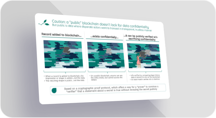 Caution: a “public” blockchain doesn’t lack for data confidentiality But public is idea where disparate actors want to transact in transparent, trustless manner …& can be publicly verified w/o Record added to blockchain… …exists confidentially… sacrificing confidentiality • When a record is added to blockchain, the • On a public blockchain, anyone can see • Info verified by comparing shape (where impression or shape is added…not the data the entry exists, but cannot access the data is known) to one on the blockchain • The resulting shape is public…not the data details • An exact match verifies info is identical Based on a cryptographic proof protocol, which offers a way for a “prover” to convince a “verifier” that a statement about a secret is true without revealing the secret publicly