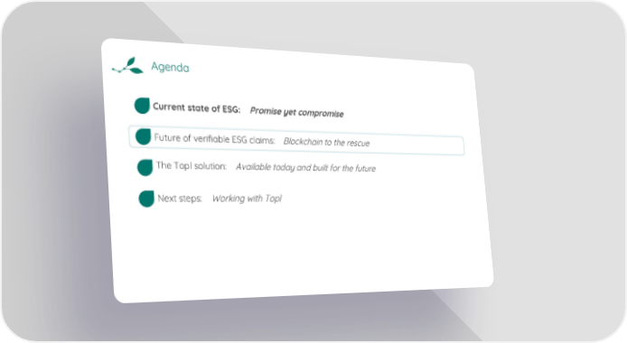 Agenda Current state of ESG: Promise yet compromise Future of verifiable ESG claims: Blockchain to the rescue The Topl solution: Available today and built for the future Next steps: Working with Topl