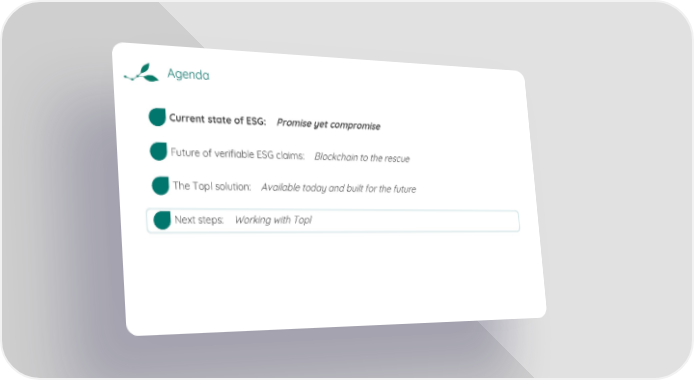 Agenda Current state of ESG: Promise yet compromise Future of verifiable ESG claims: Blockchain to the rescue The Topl solution: Available today and built for the future Next steps: Working with Topl