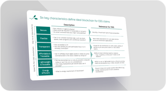Six key characteristics define ideal blockchain for ESG claims s Description Relevance for ESG ain • How robust is it against attacks? ch • What would be required to manipulate or corrupt it Secure • Do smart contracts have any major vulnerabilities? Security a “must have” part of value proposition ock bl all Flexible • Can it run complex business logic, such as smart Must meet expectations for use cases (similar to assets, chain programs and conditional transfers? across all blockchain applications) Key • How accessible is it? Access for all contributors to verify claims; ability of • Can new parties join and participate fully or is it Transparent parties to join and prove claims or view others’ ain centrally controlled? claims ch ock Affordable & • Can it verifiably track digital assets in detail at a price Ability to track individual asset vs. balance bl Traceable commensurate to the value created by doing so? • E.g., 3 quarters, 2 dimes and 1 nickel vs. $1 SG balance E • Can the blockchain be run only by powerful computer for Lightweight nodes or can it be run on a smartphone? Ability to use on lightweight device critical to proving & Scalable • How many transactions per second (tps) can it claims at provenance (e.g., in field, at plant, at mine) process? Specific Energy Ensure it does not counter positive ESG efforts (e.g. Efficient • What is energy requirement of blockchain? energy intensive proof of work consensus mechanisms)