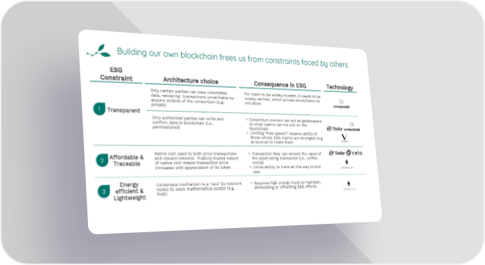 Building our own blockchain frees us from constraints faced by others ESG Constraint Architecture choice Consequence in ESG Technology Only certain parties can view committed For claim to be widely trusted, it needs to be data, rendering transactions unverifiable by widely verified, which private blockchains do anyone outside of the consortium (e.g. not allow private) 1 Transparent Only authorized parties can write and • Consortium owners can act as gatekeepers confirm data to blockchain (i.e., to what claims can me put on the permissioned) blockchain • Limiting “free speech” lessens ability of those whose ESG claims are strongest (e.g. at source) to make them Affordable & Native coin used to both price transactions • Transaction fees can exceed the value of 2 and reward network. Publicly traded nature the asset being transacted (i.e., coffee, Traceable of native coin means transaction price cocoa) increases with appreciation of its token • Limits ability to track all the way to end user Energy Consensus mechanism is a ‘race’ by network • Requires high energy input to maintain, 3 efficient & nodes to solve mathematical puzzle (e.g. diminishing or offsetting ESG efforts Lightweight PoW)