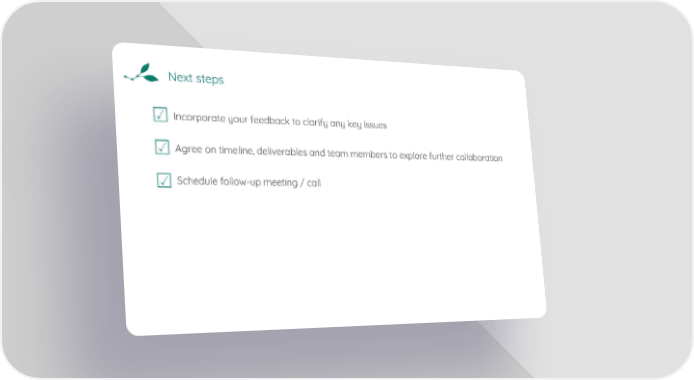 Next steps Incorporate your feedback to clarify any key issues Agree on timeline, deliverables and team members to explore further collaboration Schedule follow-up meeting / call