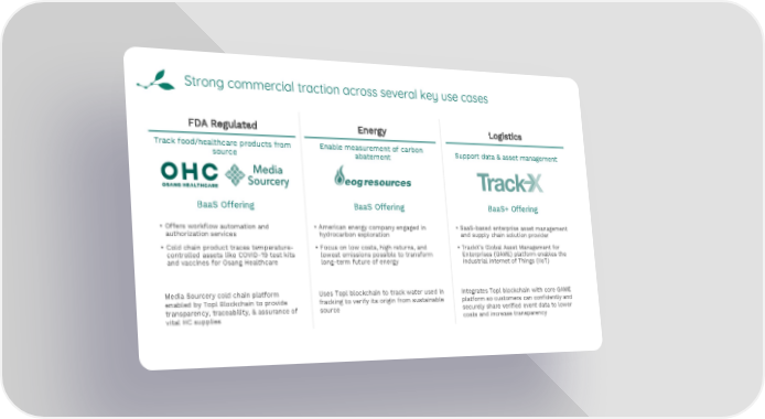 Strong commercial traction across several key use cases FDA Regulated Energy Logistics Track food/healthcare products from Enable measurement of carbon Support data & asset management source abatement BaaS Offering BaaS Offering BaaS+ Offering • Offers workflow automation and • American energy company engaged in • SaaS-based enterprise asset management authorization services hydrocarbon exploration and supply chain solution provider • Cold chain product traces temperature- • Focus on low costs, high returns, and • TrackX’s Global Asset Management for controlled assets like COVID-19 test kits lowest emissions possible to transform Enterprises (GAME) platform enables the and vaccines for Osang Healthcare long-term future of energy Industrial Internet of Things (IIoT) Media Sourcery cold chain platform Uses Topl blockchain to track water used in Integrates Topl blockchain with core GAME enabled by Topl Blockchain to provide fracking to verify its origin from sustainable platform so customers can confidently and transparency, traceability, & assurance of source securely share verified event data to lower vital HC supplies costs and increase transparency