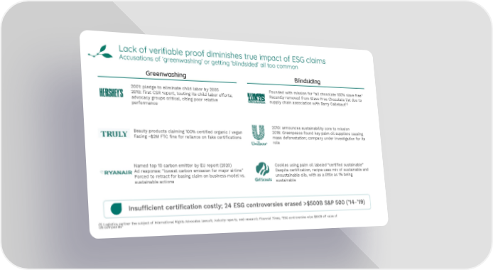 Lack of verifiable proof diminishes true impact of ESG claims Accusations of ‘greenwashing’ or getting ‘blindsided’ all too common Greenwashing Blindsiding 2001: pledge to eliminate child labor by 2005 Founded with mission for “all chocolate 100% slave free” 2010: first CSR report, touting its child labor efforts; Recently removed from Slave Free Chocolate list due to advocacy groups critical, citing poor relative supply chain association with Barry Callebaut(1) performance 2010: announces sustainability core to mission Beauty products claiming 100% certified organic / vegan 2018: Greenpeace found key palm oil suppliers causing Facing ~$2M FTC fine for reliance on fake certifications mass deforestation; company under investigation for its role Named top 10 carbon emitter by EU report (2020) Cookies using palm oil labeled “certified sustainable” Ad response: “lowest carbon emission for major airline” Despite certification, recipe uses mix of sustainable and Forced to retract for basing claim on business model vs. unsustainable oils, with as a little as 1% being sustainable actions sustainable Insufficient certification costly; 24 ESG controversies erased >$500B S&P 500 (’14-’19) (1) Logistics partner the subject of International Rights Advocates lawsuit; Industry reports, web research; Financial Times, “ESG controversies wipe $500B off value of US companies”